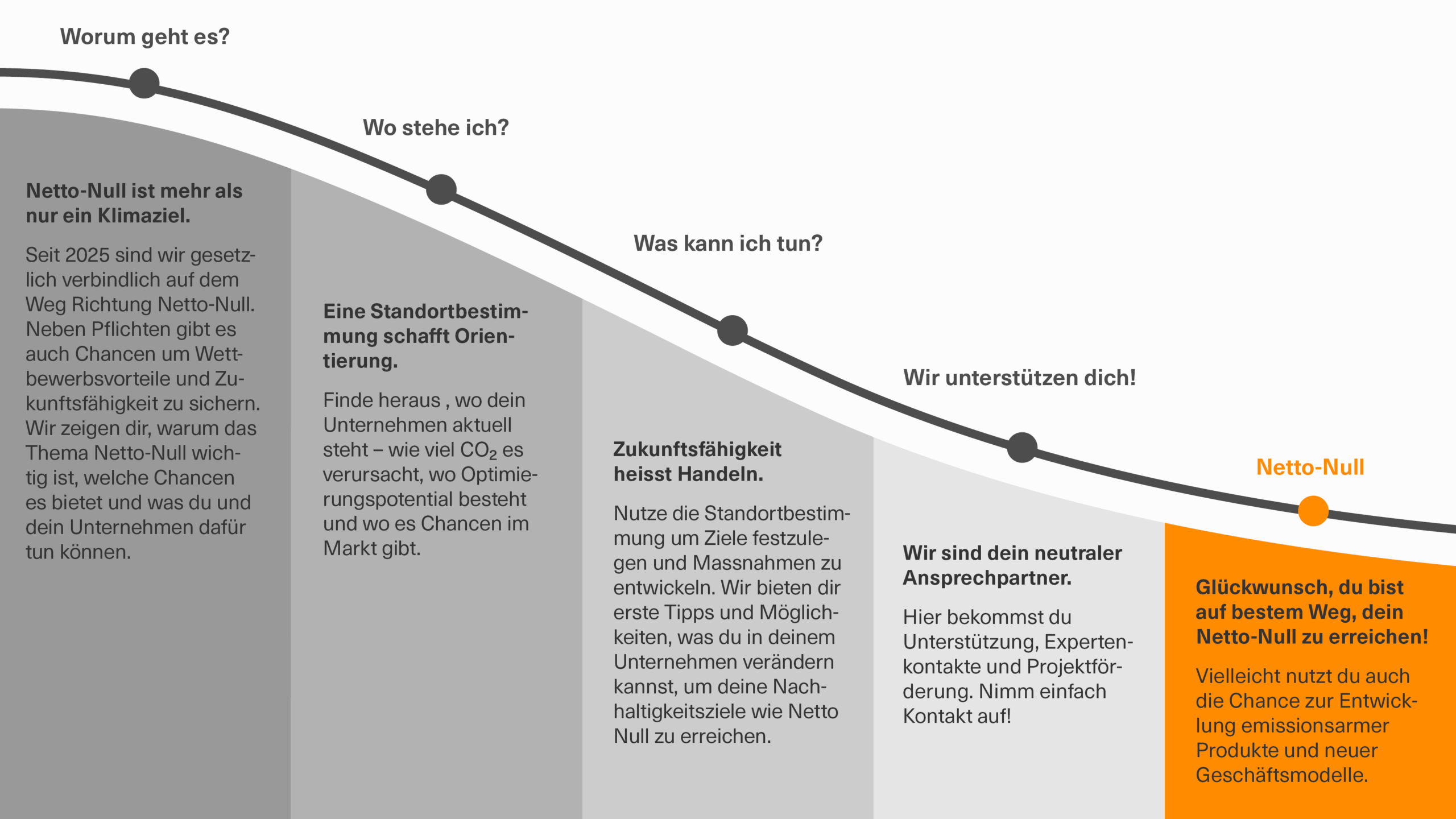 Wir vermitteln verlässliche Informationen, passende Partnerorganisationen, Förderinstrumente, Netto-Null Expertise und praxisnahe Hilfsmittel. Passend zu deiner Unternehmensgrösse und Branche. Für Fragen zur Liste oder weiterführenden Informationen – kontaktiere uns!